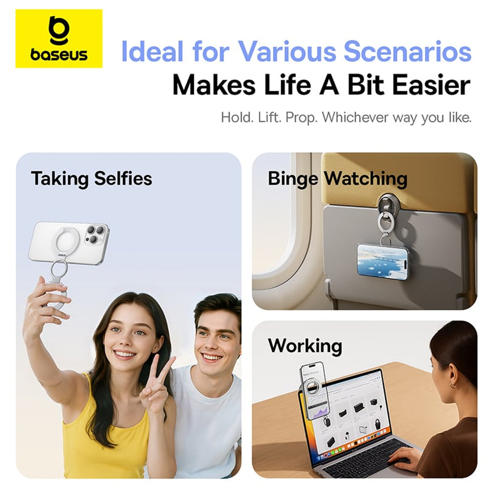 • Forget about bulky stands that take up a lot of space on your desk and choose a foldable phone stand from Baseus! Additionally, you can use it as a phone grip ring for safer and more comfortable use.
