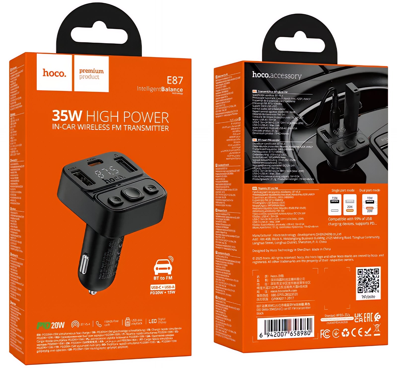 The HOCO E87 Bluetooth FM Modulator combines the functions of a rapid car charger and FM transmitter into a single compact and practical device. The dual charging ports