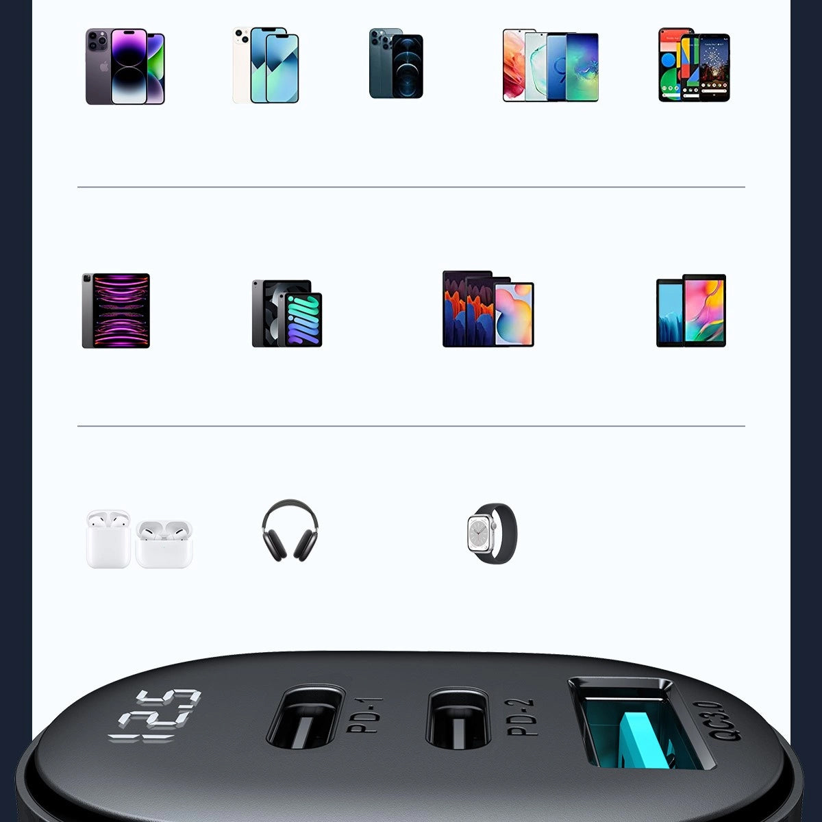 it allows simultaneous charging of three devices. The integrated digital display monitors voltage in real time, ensuring safety and efficiency.