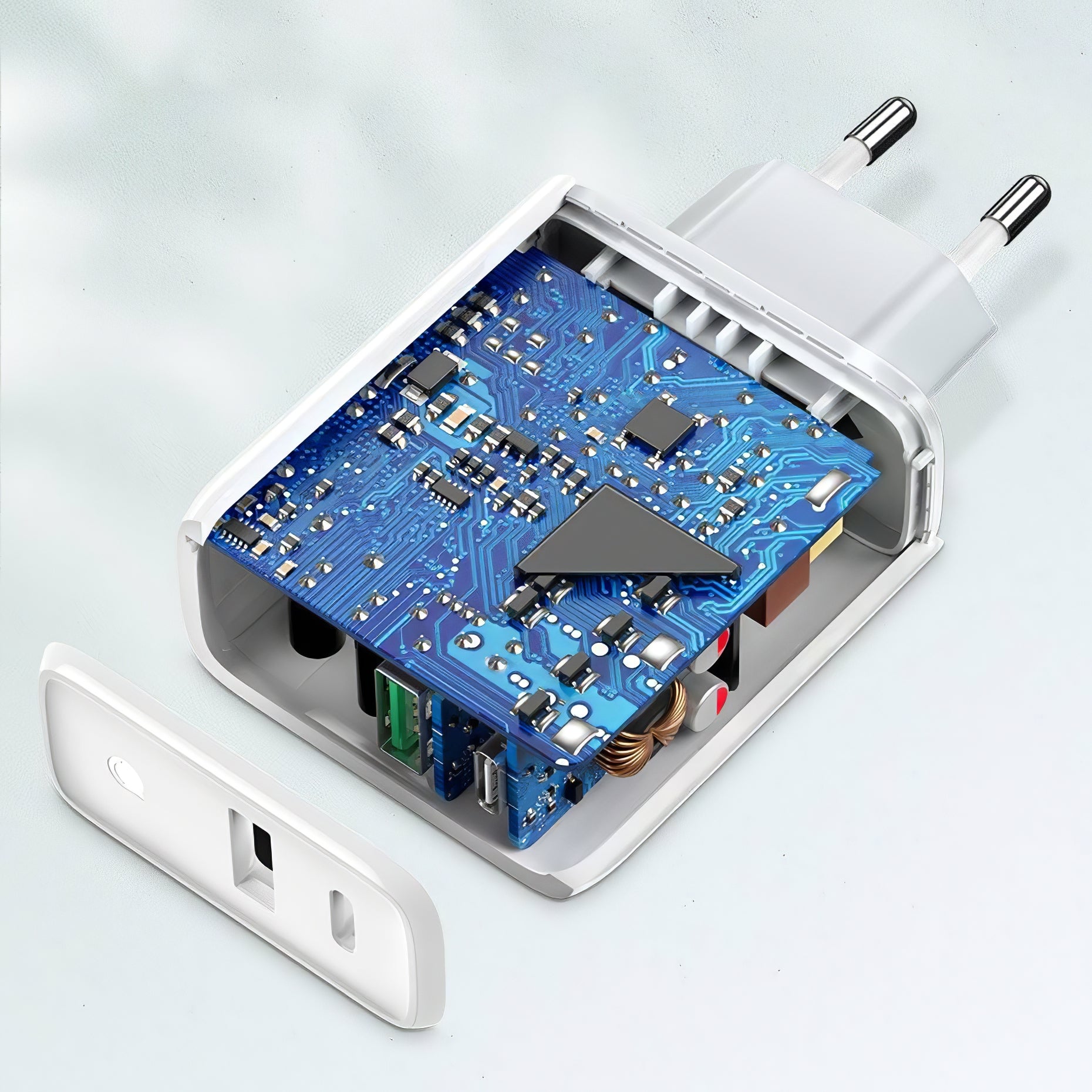 It is compatible with most fast charging protocols and adapts the voltage according to the need of the device it charges.