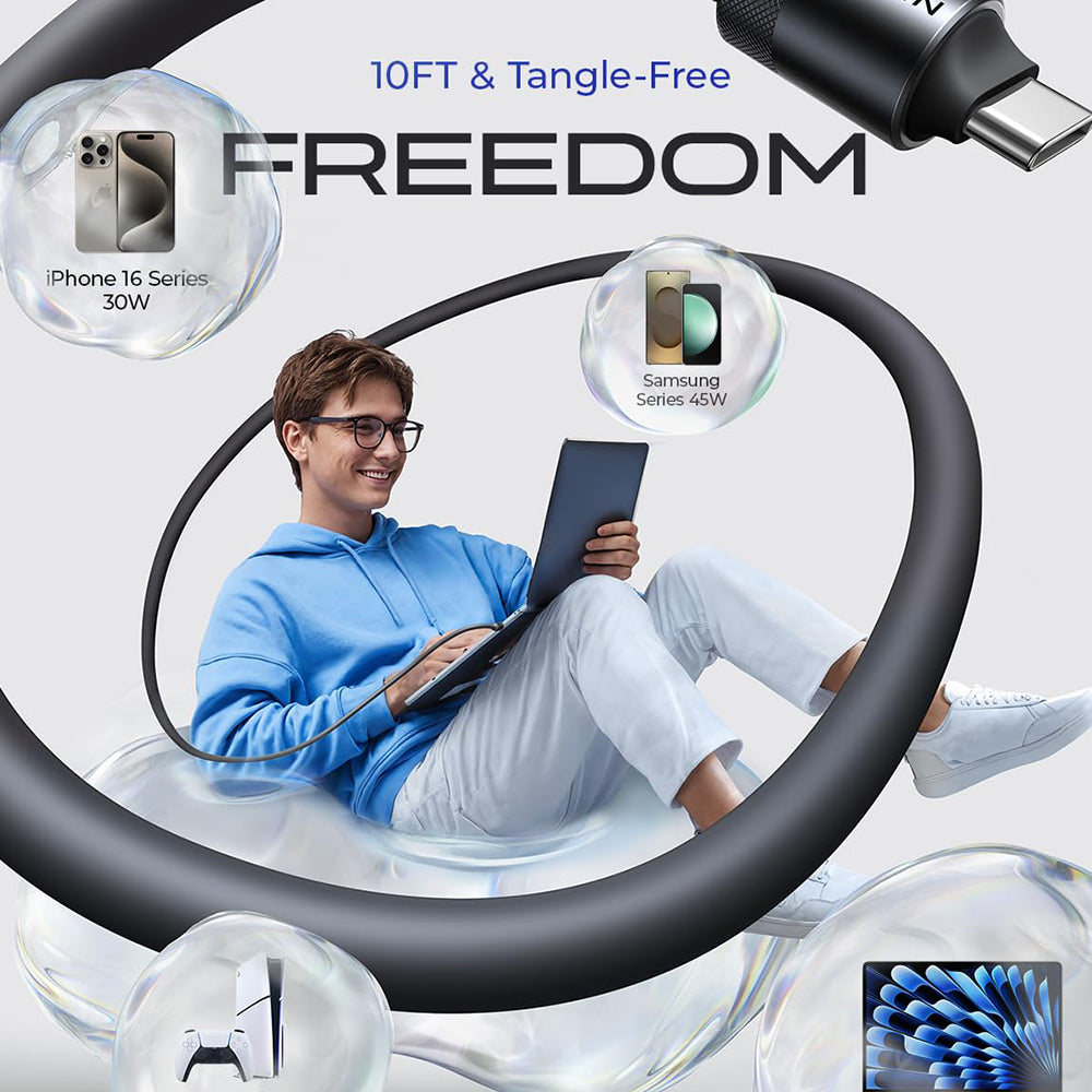 Fabriqué en silicone alimentaire premium, le câble offre une flexibilité supérieure et une sensation agréable au toucher. De plus, sa structure renforcée prolonge la durée de vie à plus de 50 000 flexions.