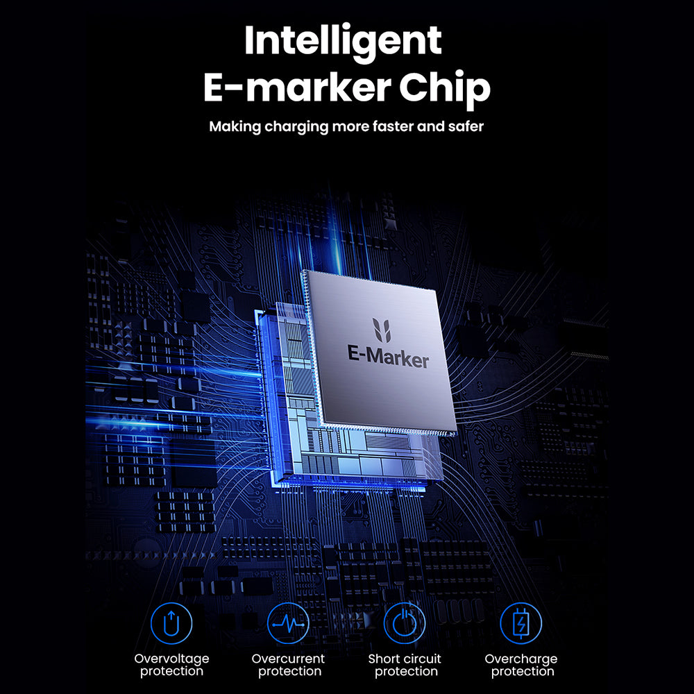 60 minutes - 2.5 fois plus rapide que les câbles ordinaires. La puce intelligente E-marker régule automatiquement la tension et le courant pour la sécurité des appareils, prévenant