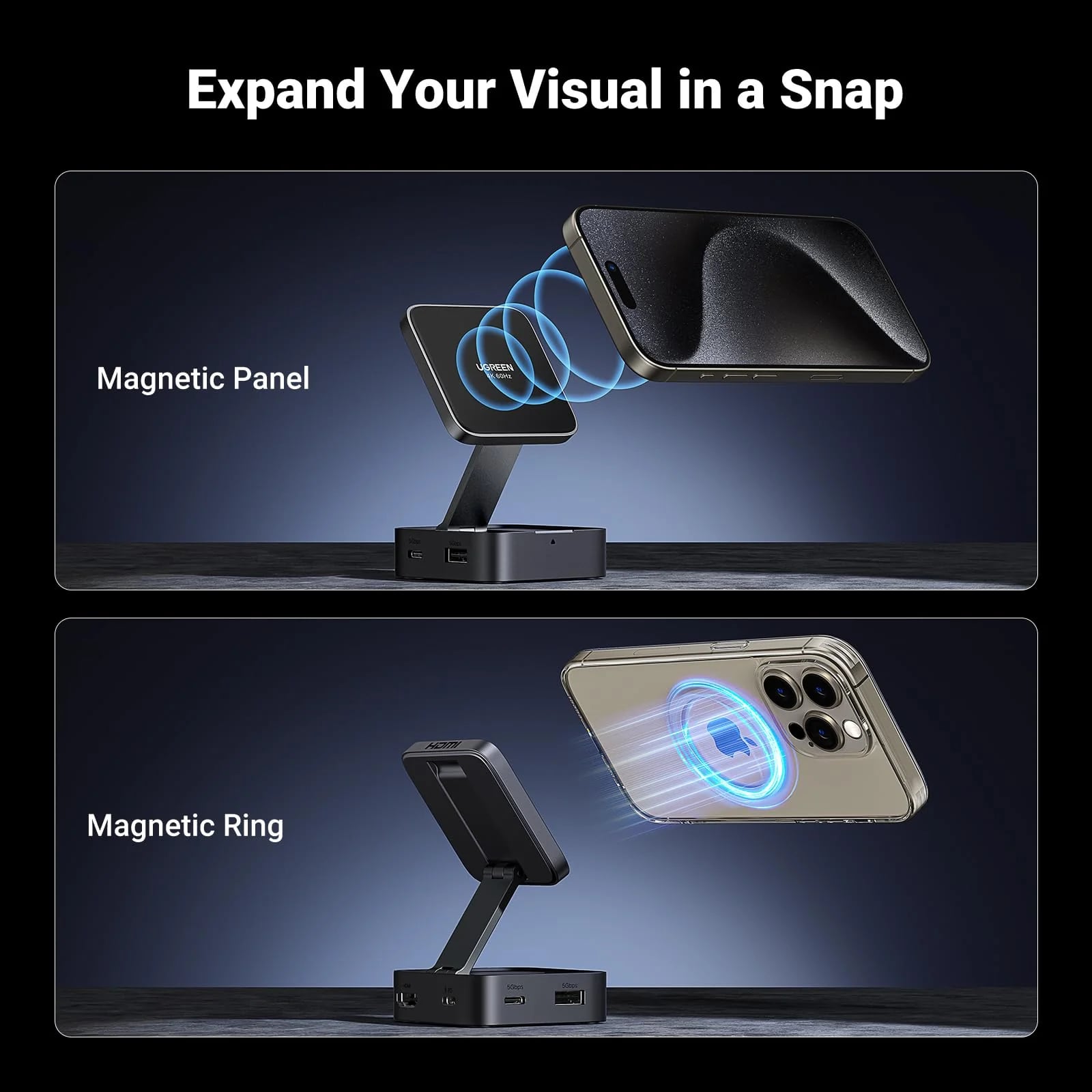 Équipé d'un système magnétique puissant de 9N et d'un anneau magnétique dédié, le hub se fixe fermement et en toute sécurité sur les appareils compatibles,