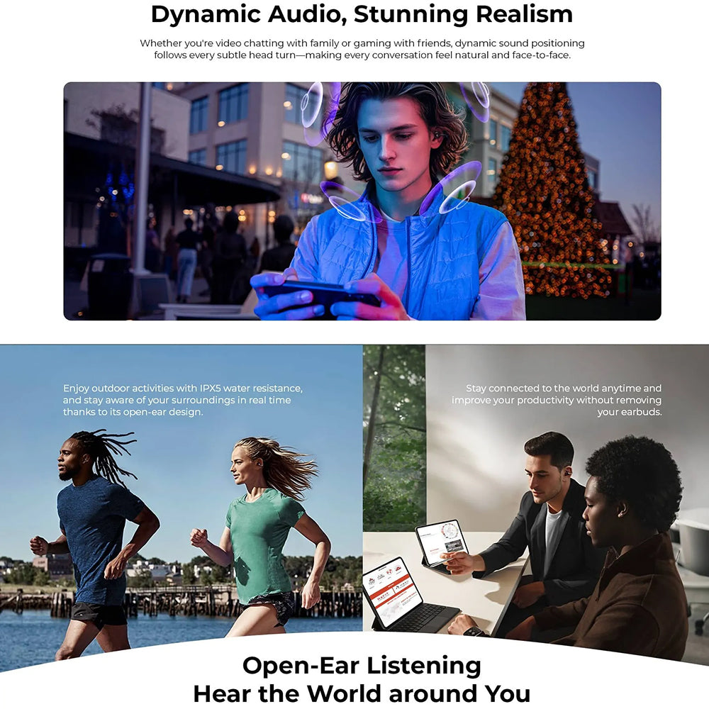 • Avec un design open-ear qui se fixe discrètement, les écouteurs Bluetooth restent confortables toute la journée, sans exercer de pression dans les canaux auditifs.