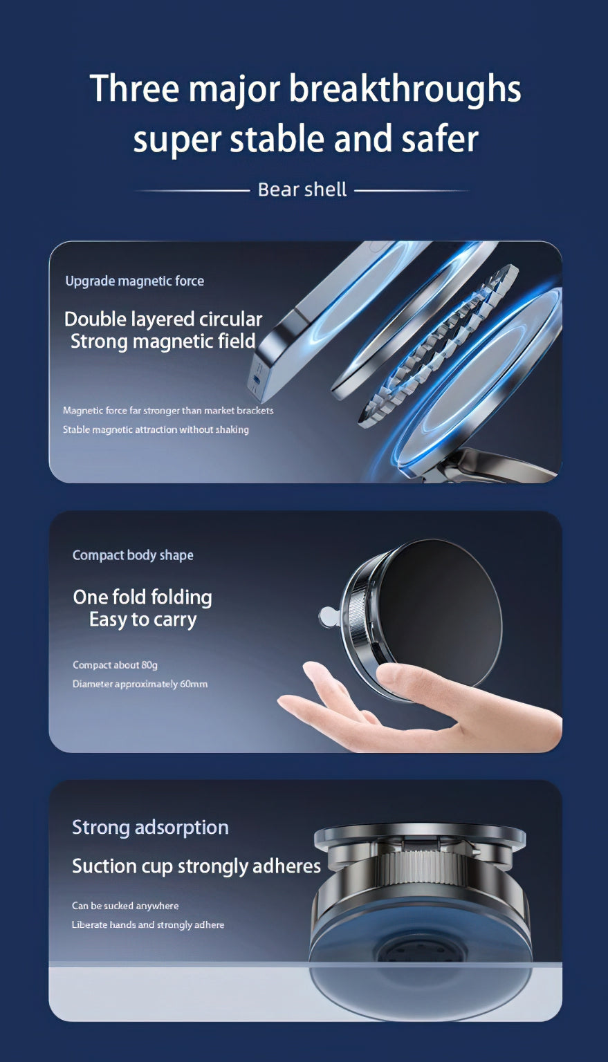 permet une installation et un retrait faciles sur différentes surfaces lisses - tableau de bord, pare-brise, bureau ou mur. Avec 17 aimants puissants N52,