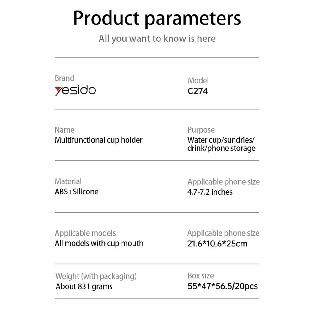 Yesido C274 est un support auto multifonctionnel 4-en-1, conçu pour les conducteurs qui recherchent ordre, stabilité et fonctionnalité maximale dans l'habitacle.